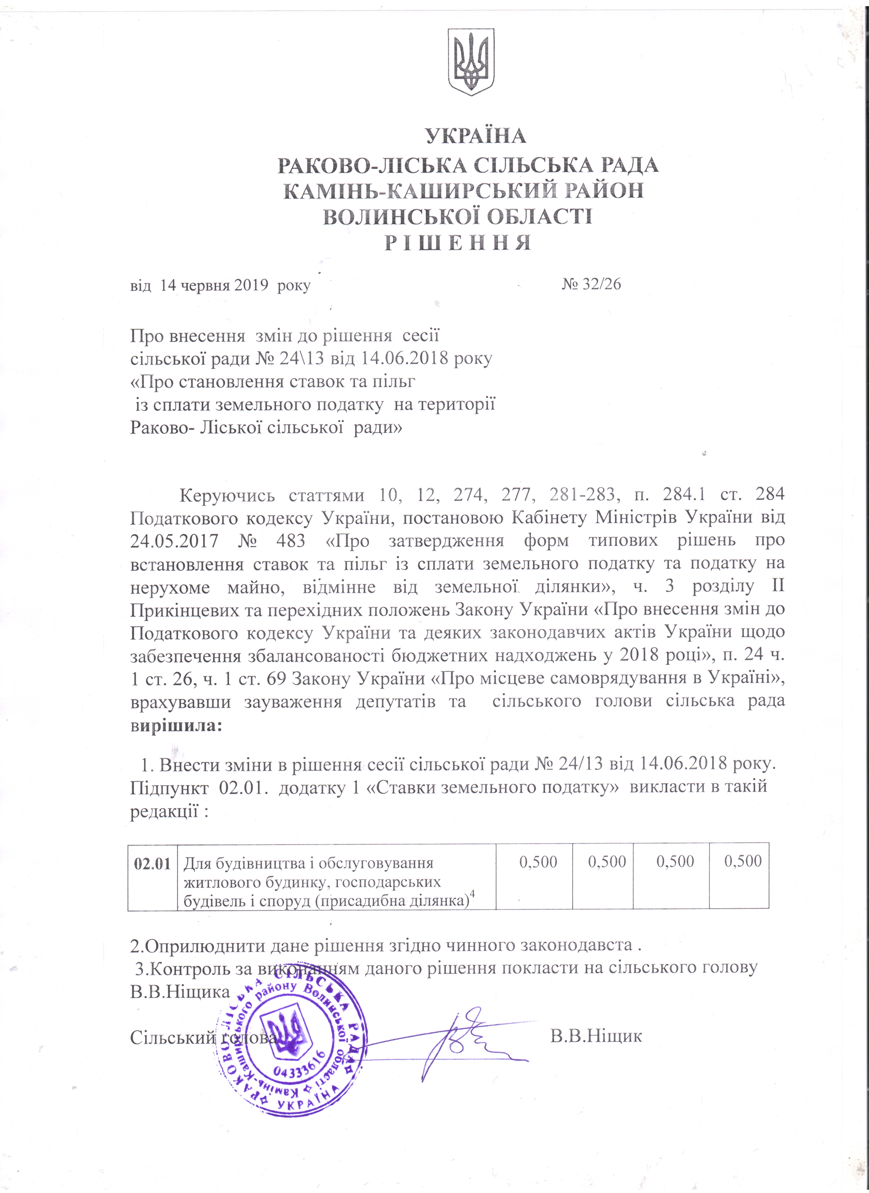 "Про внесення змін до рішення сесії сільської ради № 24/13 від 14.06.2018 р. "Про становлення ставок та пільг із сплати земельного податку на території Раково-Ліської сільської ради"